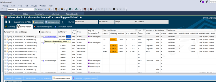 Intel Advisor XE initially sorts data by self time (time actually spent in the routine, excluding calls to other routines from within it), and abasicmm1 is at the top. The information from the compiler report about assumed dependency as a reason preventing vectorization is listed as well as information showing that the loop was not vectorized. Additional helpful information can be collected such as the number of loop trip counts. Intel Advisor XE conveniently combines much of the information from compiler reports as well as runtime and performance analysis into one location.