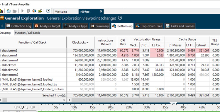 Unexpectedly, abasicmm2 (SIMD dot product oriented matrix multiply) performed an order of magnitude worse than abasicmm1 (scalar dot product oriented matrix multiply). This is currently unexplained. As the compiler reported this loop as vectorized, it reinforces the admonition to not rely purely on compiler reports, but to combine performance data and compiler reports together. The timings are shown in the clock ticks column of Figure 5. The KNC data was collected with both TAU Performance System and Intel VTune Amplifier XE. The TAU data is displayed graphically using ParaProf (see Figure 4).