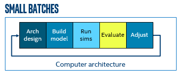 In general, the architecture of computer processor cores and processing blocks is done by using “cycle accurate” architecture simulators. Indeed, the software simulator is often the primary tool for computer architects. By using a simulator, you get small batches very naturally – the design is now just software and can be changed as easily as software changes.