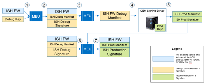 Intel signs all firmware components to be loaded by the Intel® CSME. OEMs may add or replace capabilities for several components, such as ISH and Audio and Context Engine (ACE). Components must be signed, and an OEM KM is required to load any OEM components and use their capabilities.