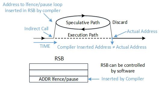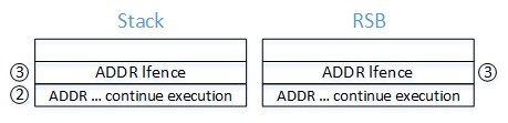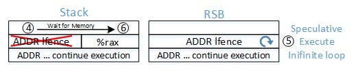 - “6. ret". If speculating, the CPU consumes the RSB entry created in step 3 and jumps to 3: pause ; LFENCE”. It is “trapped” in an infinite loop. The Speculation Barriers section has more details about the importance of this sequence.