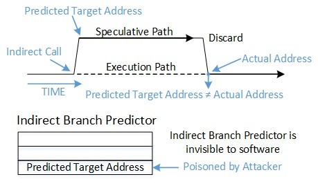 As discussed earlier, the branch target injection exploit relies on influencing the speculated targets of indirect branches. Indirect JMP and CALL instructions consult the indirect branch predictor to direct speculative execution to the most likely target of the branch. The indirect branch predictor is a relatively large hardware structure which cannot be easily managed by the operating system. Instead of attempting to manage or predict its behavior, a retpoline is a method to bypass the indirect branch predictor. Refer to Figure 1 and Figure 2 for the flow of indirect-branch prediction before and after retpoline is implemented.