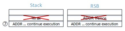 - “5. mov %rax, (%rsp)" which takes the target of the indirect call (in %rax) and writes it over the return address stored on the stack. At this point the in-memory stack and the RSB differ.