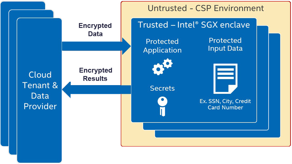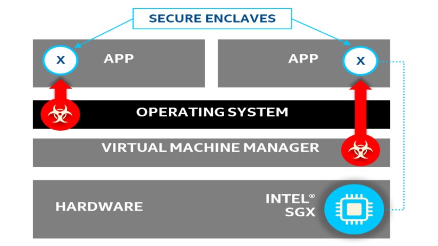 Intel SGX is a set of instructions that increases the security of application code and data, giving them more protection from unauthorized disclosure or modification. Developers can partition sensitive information into enclaves, which are areas of execution in encrypted memory with more security protection.