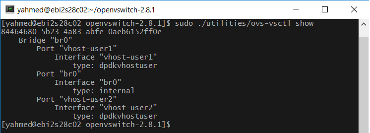 We now have full OvS built with DPDK support enabled. All the standard OvS utilities can be found under $OVS_DIR/utilities/, and OvS DB under $OVS_DIR/ovsdb/. We will use the utilities under these locations for the next steps.