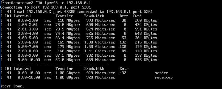 Configure the NIC IP address on both VMs to be on the same subnet. Install iPerf3 from http://software.es.net/iperf, and then run a simple network test case. On one VM, start iPerf3 in server mode iperf3 -s and run the iperf3 client on the other VM, iperf3 –c server_ip. The network throughput and performance varies, depending on your system hardware capabilities and configuration.