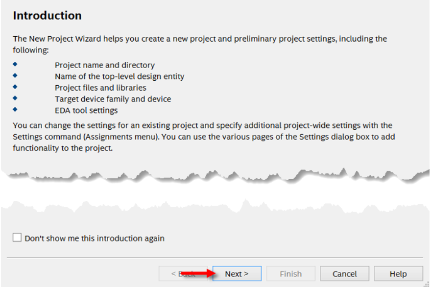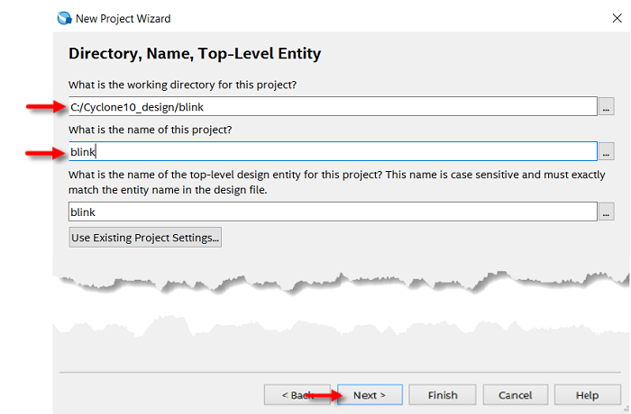 Choose a directory to put your project under. Here, we name our project “Blink” and place it under the intelFPGA_lite folder but you can place it wherever you want. Select Next.