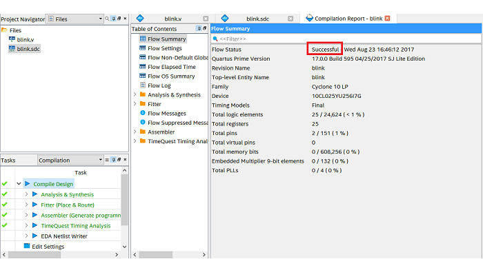 Right click on Compile Design, and then click Start. The tools will then synthesize, place and route, assemble and perform timing analysis on the design Because there are only have a handful of code lines, the compilation should only take a couple of minutes to complete.