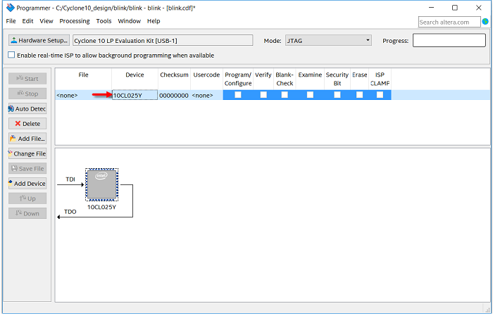 Here, blink.sof is your programming file. SRAM Object Files (.sof files) are binary files containing data for configuring SRAM-based devices—our FPGA is based on SRAM—using the Intel® Quartus® software Program Device (also called Programmer). The programmer looks into the SOF file and gets the programming bit stream for the device.