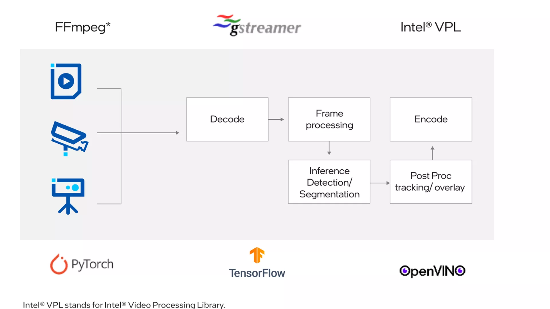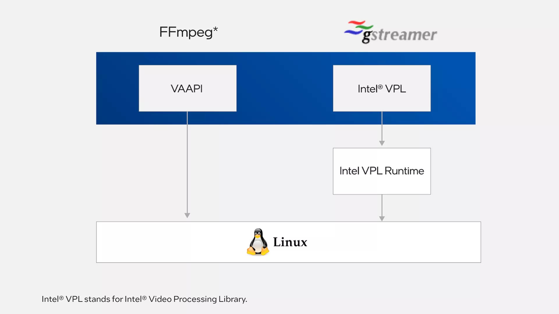 For hardware-accelerated decode, encode, and frame processing, use Intel-optimized FFmpeg and GStreamer or Intel® Video Processing Library (Intel® VPL).