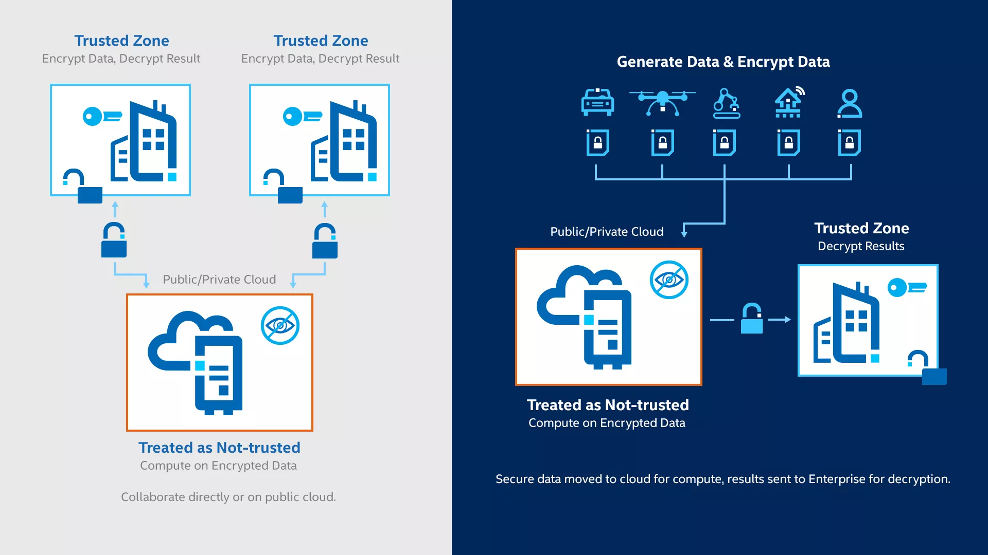 Intel is enabling the emerging HE ecosystem by accelerating HE to meet commercial performance requirements on real-world future use cases. The toolkit has been designed as an extensible solution to take advantage of the latest Intel® Advanced Vector Extensions 512 (Intel® AVX-512) acceleration instructions. The toolkit can also be combined with future purpose-built accelerator technology.