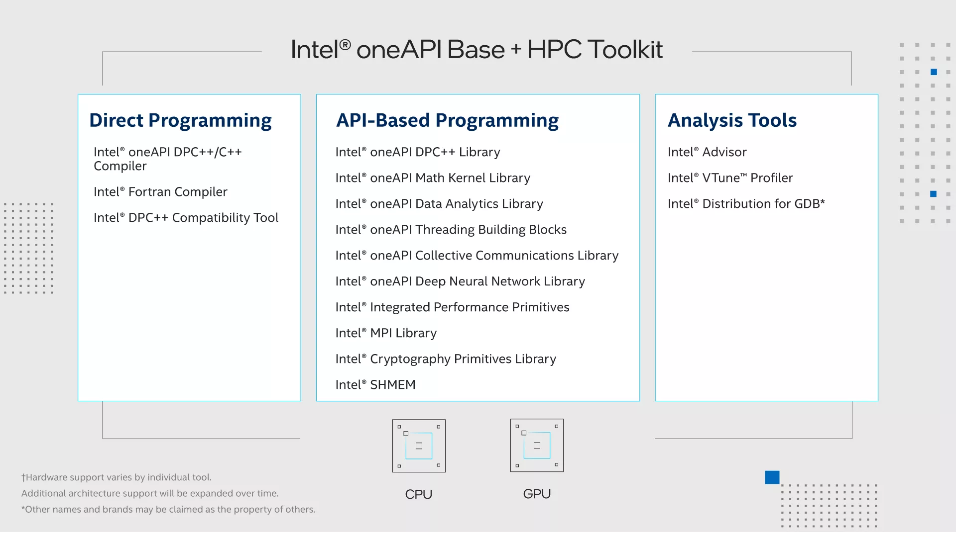 Intel toolkits are the next generation of standards-based toolkits used to build and deploy high-performance, data-centric applications across diverse architectures. The transition from Intel® Parallel Studio XE to Intel toolkits delivers additional capabilities through existing tools and new tools. The following information shows Intel Parallel Studio XE Editions and the equivalent Intel oneAPI Base & HPC Toolkit products.