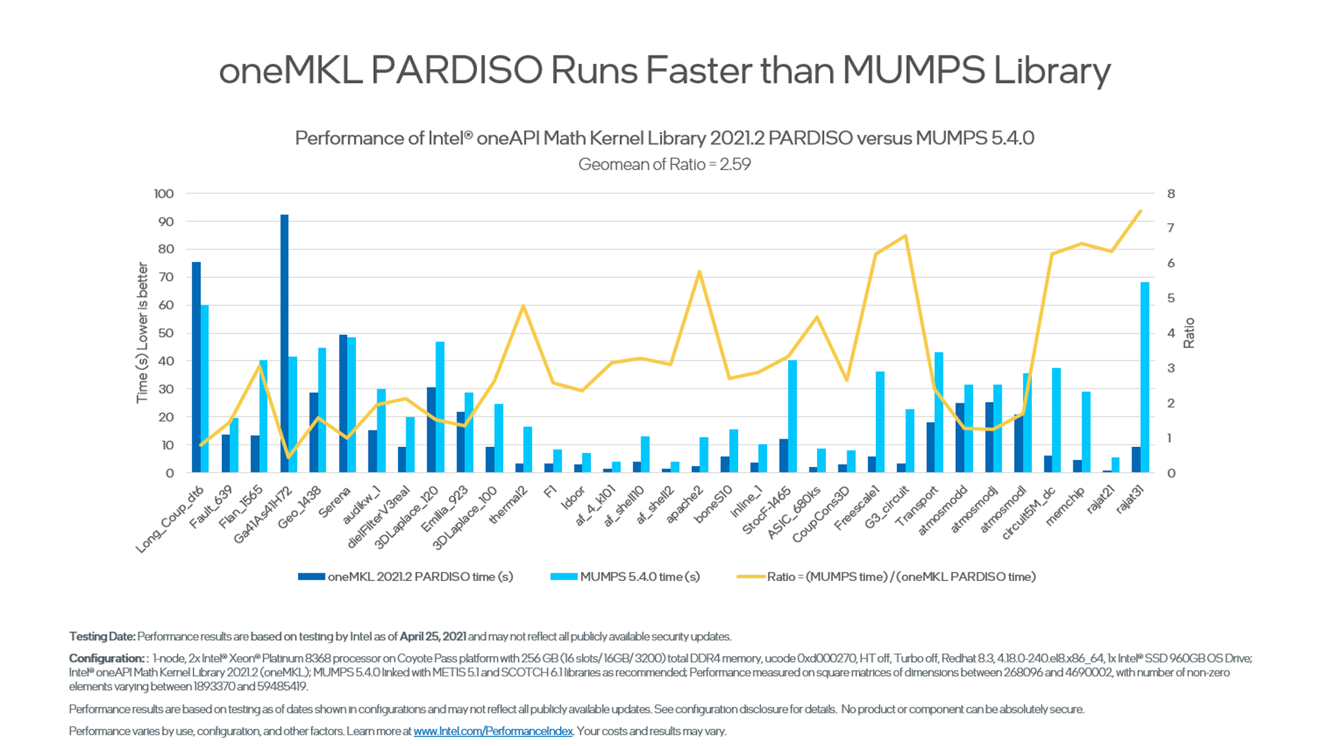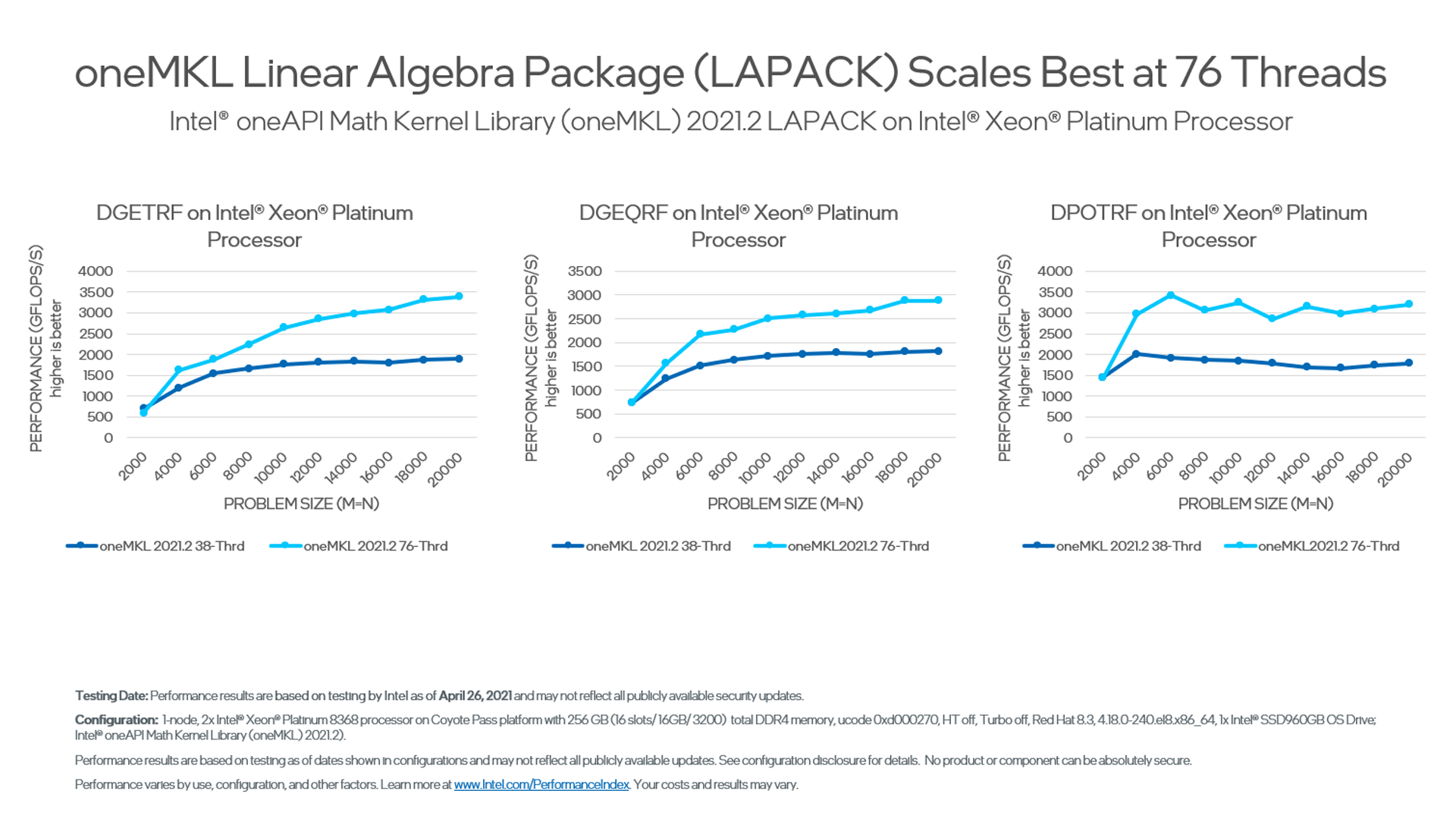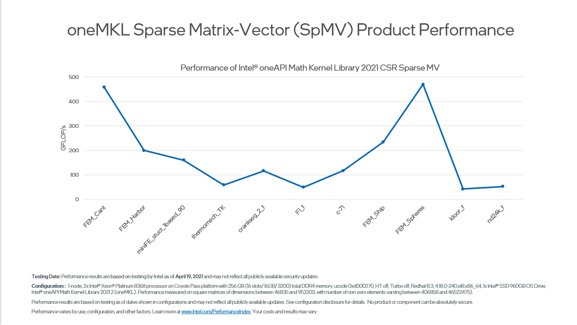 These benchmarks are offered to help you make informed decisions about which routines to use in your applications, including performance for each major function domain in oneMKL by processor family. Some benchmark charts only include absolute performance measurements for specific problem sizes. Others compare previous versions, popular alternate open-source libraries, and other functions for oneMKL.