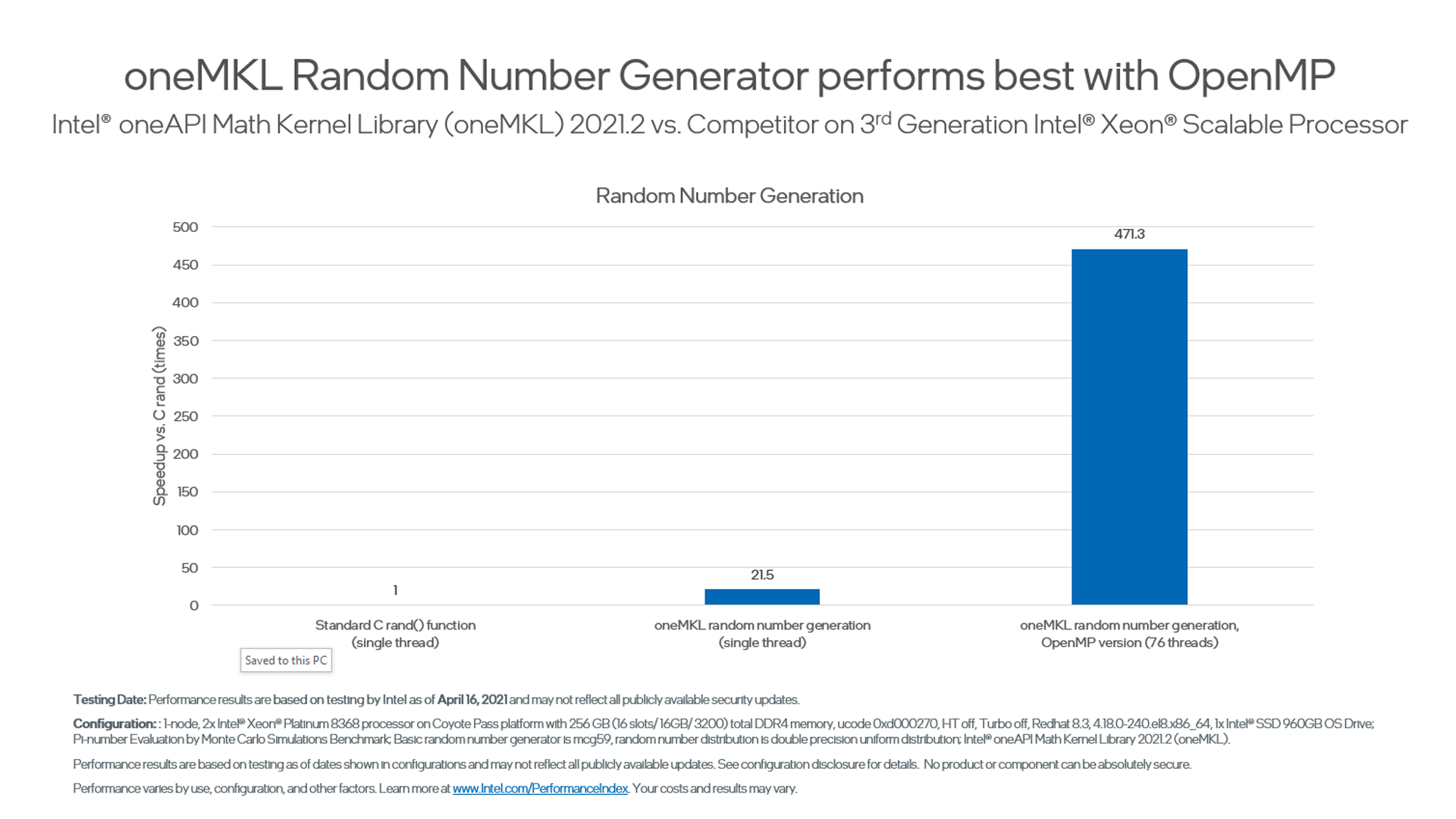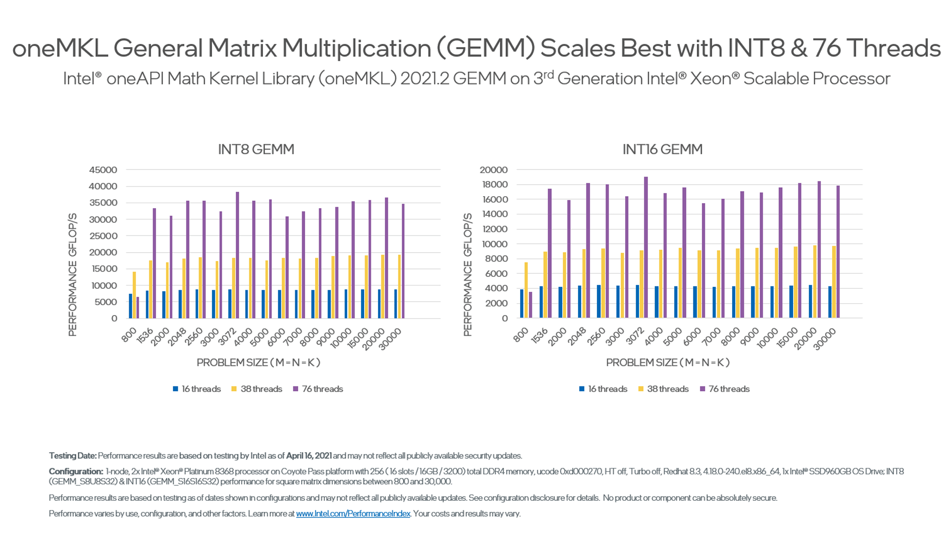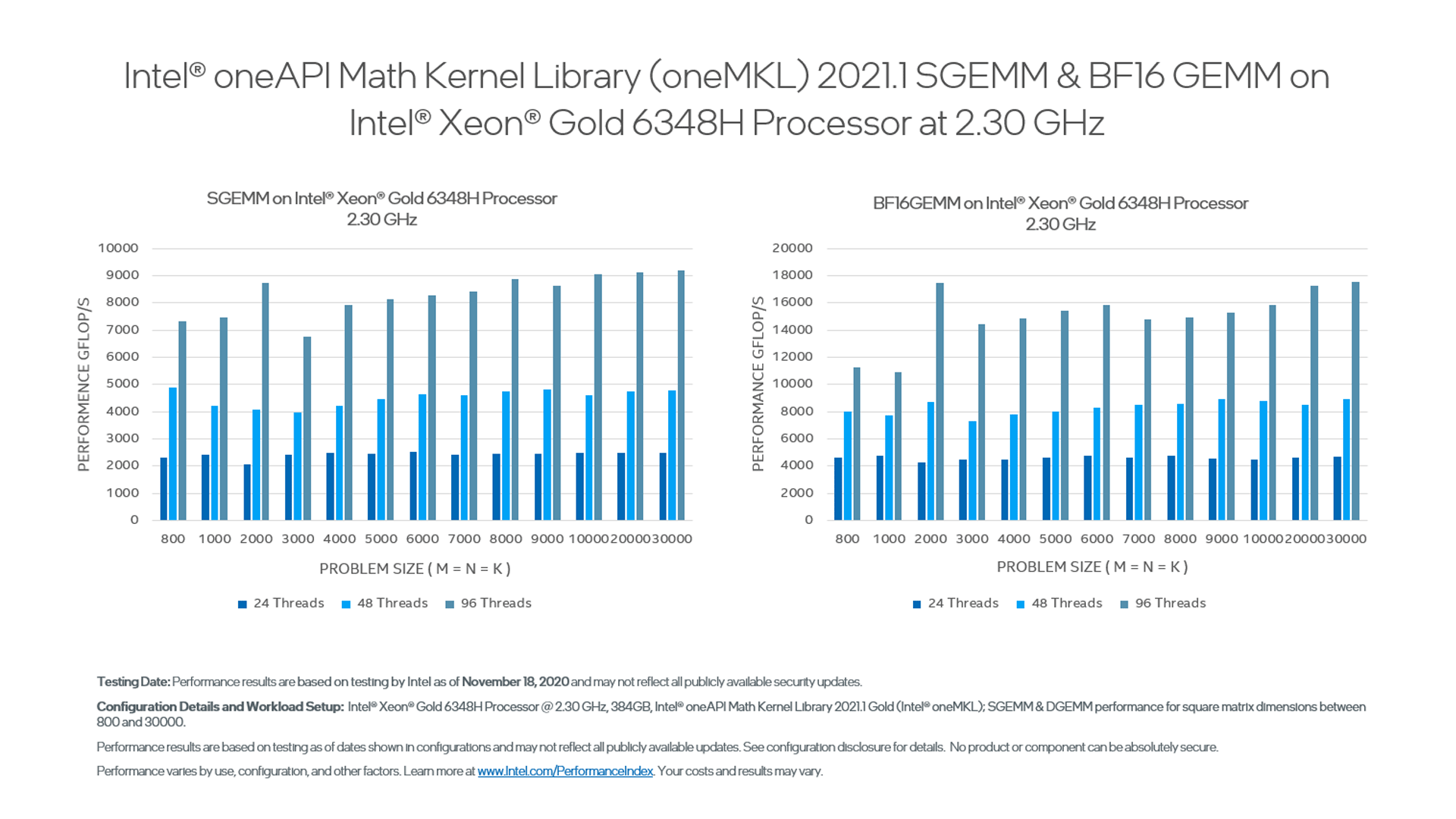 These benchmarks are offered to help you make informed decisions about which routines to use in your applications, including performance for each major function domain in oneMKL by processor family. Some benchmark charts only include absolute performance measurements for specific problem sizes. Others compare previous versions, popular alternate open-source libraries, and other functions for oneMKL.