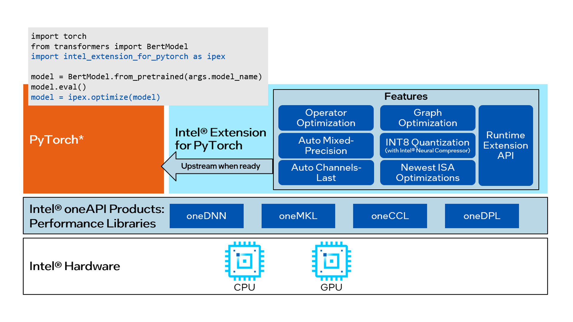 • Get the best PyTorch training and inference performance on Intel CPU or GPU hardware through open source contributions from Intel.