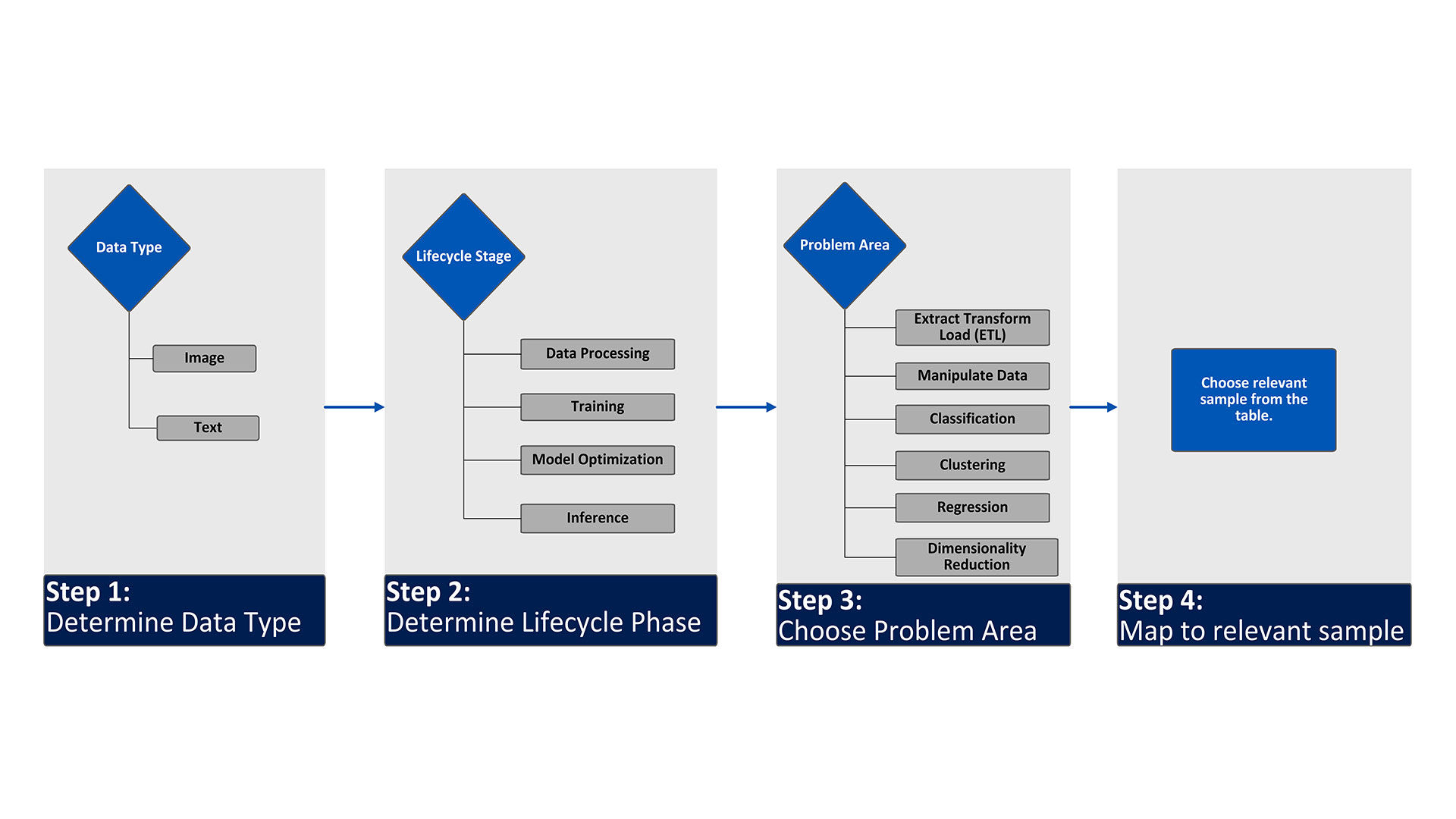 Learn the basic workflow and recommended path to identify and find the right AI Tools sample for your AI analytics projects based on the data type, lifecycle stage, and tasks you need to perform.