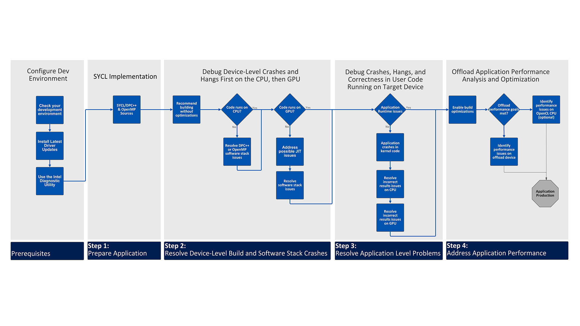 This workflow provides a recommended path for troubleshooting, as well as documentation and resources for common problems. For hands-on learning, there are three samples referenced in the workflow, all based on matrix multiply. The samples include source code with errors and source code that illustrates the solution with step-by-step instructions.
