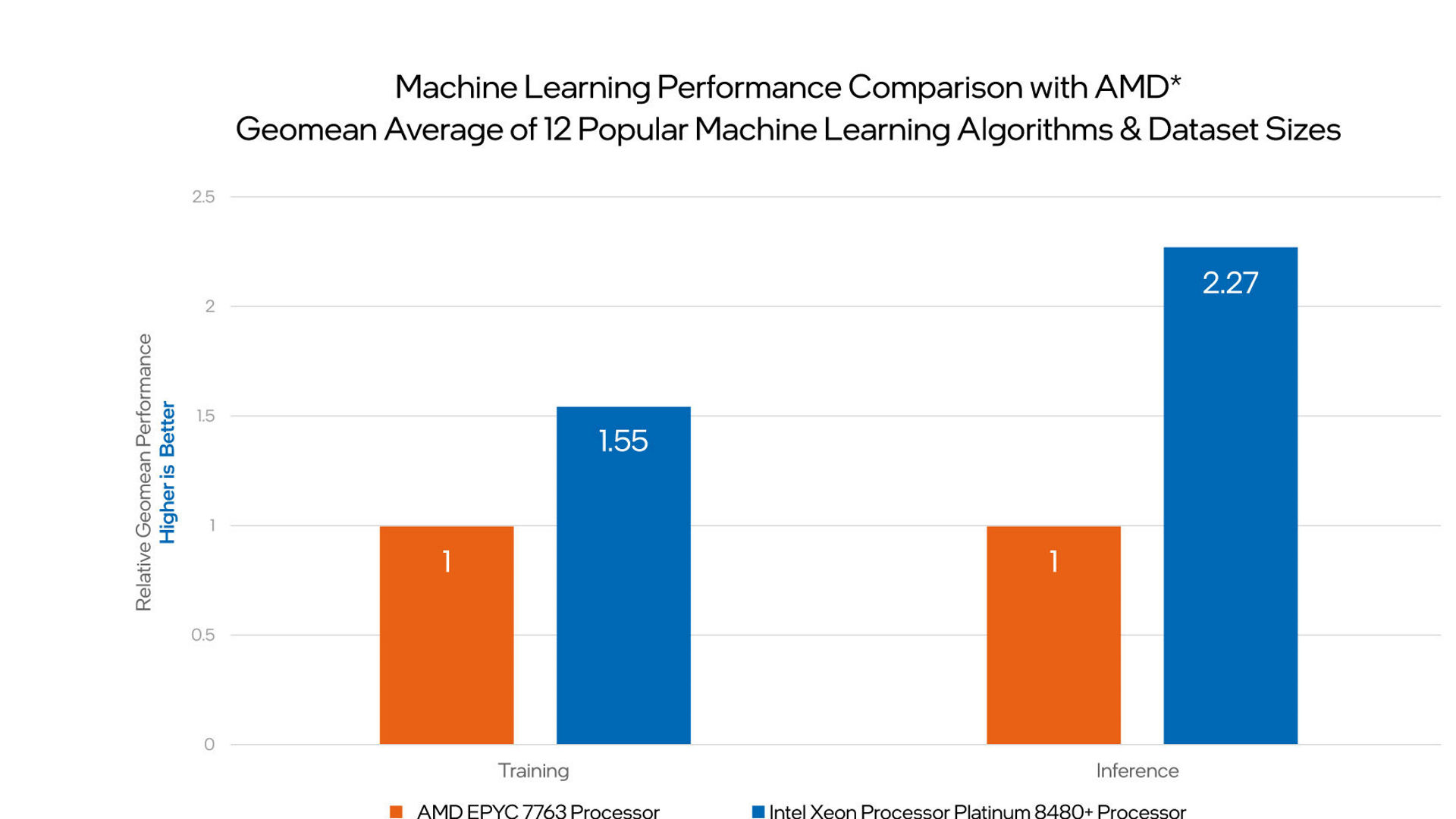 7. Machine learning comparison with AMD EPYC. See [A202] of the Performance Index for 4th Gen Intel Xeon Scalable processors. Results may vary.