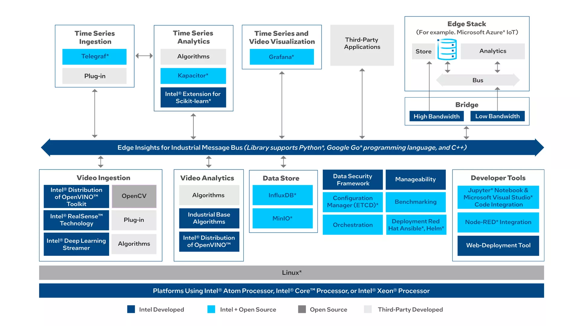 Integrate video and time-series data analytics on edge compute nodes for industrial use cases using prevalidated software components.