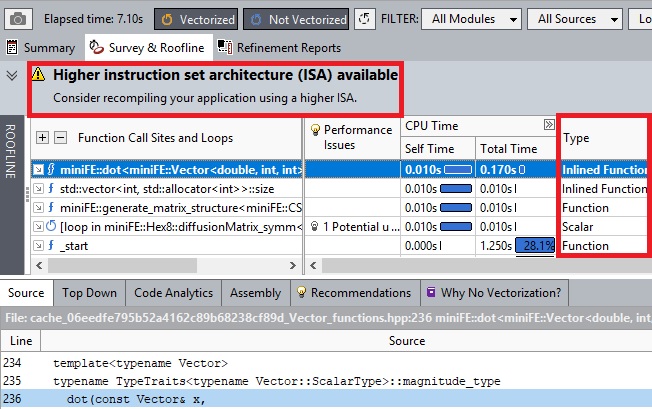 Expected result for the miniFE miniapp: This is a poor implementation, with no vectorized code sections and a compilation that did not use the best available Instruction Set Architecture (ISA).