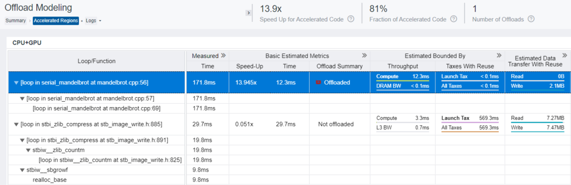 For the Mandelbrot application, the loop at mandelbrot.cpp:56 is recommended for offloading to the GPU. It is compute bound and its estimated execution time on the Gen9 GT2 GPU is 12.3 ms. This region transfers 2.1 MB of data, mostly from GPU to CPU (write data transfers), but it does not add overhead since the GPU is integrated.