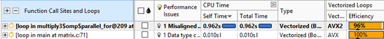 Notice the loop is now vectorized at 96% efficiency using AVX2: