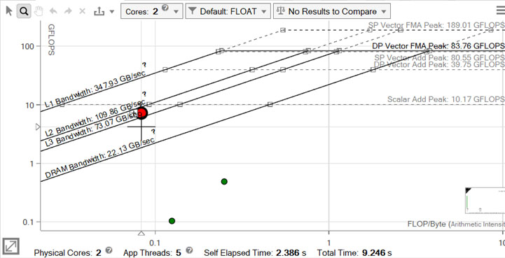 The red dot is the main computational loop. Notice it is far below the DRAM bandwidth maximum, indicated by the lowest diagonal line. This tells us the loop has potential problems with memory accesses.