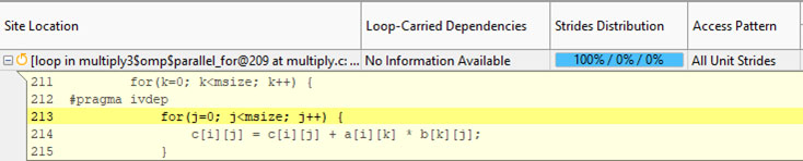 Unit stride is preferred for vectorization; however, the Intel Advisor detects 50% constant strides and 50% unit strides for this loop. Equally important, the Intel Advisor detects a constant stride of 2048 on the read access and a uniform stride of 0 on the write access, while the range of memory accessed is 6 MB.