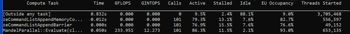 ============================================================ Main GPU Dataset ============================================================ … ============================================================ … carm_l3_cache_line_utilization_______________: 1 carm_slm_cache_line_utilization______________: 0 carm_traffic_gb______________________________: 0.105906 computing_task_______________________________: MandelParallel::Evaluate(cl::sycl::queue&)::{lambda(cl::sycl::handler&)@235:14}::operator()(cl::sycl::handler&) const::{lambda()@240:44} computing_task_average_time__________________: 0.000498183 … elapsed_time_________________________________: 0.0503165 … gpu_compute_performance_fp_ai________________: 852.558 gpu_compute_performance_gflop________________: 11.7716 gpu_compute_performance_gflops_______________: 233.951 gpu_compute_performance_gintop_______________: 0.617538 gpu_compute_performance_gintops______________: 12.2731 gpu_compute_performance_gmixop_______________: 12.3891 gpu_compute_performance_gmixops______________: 246.224 gpu_compute_performance_int_ai_______________: 44.7253 gpu_compute_performance_mix_ai_______________: 897.283 gpu_memory_bandwidth_gb_sec__________________: 0.27441 gpu_memory_bandwidth_gb_sec_read_____________: 0.233971 gpu_memory_bandwidth_gb_sec_write____________: 0.0404391 gpu_memory_data_transferred_gb_______________: 0.0138074 gpu_memory_data_transferred_gb_read__________: 0.0117726 gpu_memory_data_transferred_gb_write_________: 0.00203475 … work_size_global_____________________________: 512 x 512 work_size_local______________________________: 256 x 1 ============================================================ Instruction Mix Dataset ============================================================ zeCommandListAppendMemoryCopyRegion: 0 ============================================================ zeCommandListAppendBarrier: 2 ============================================================ MandelParallel::Evaluate(cl::sycl::queue&)::{lambda(cl::sycl::handler&)@235:14}::operator()(cl::sycl::handler&) const::{lambda()@240:44}: 1 Type: Size: Op Type : Callcount : Exec Count : Dynamic Count INT : 32 : MOVE : 104,403,397 : 1,488,428,112 : 1,351,879,647 INT : 32 : BIT : 3,309,568 : 28,131,328 : 28,131,328 INT : 32 : BASIC : 190,604,170 : 509,977,482 : 509,977,482 : : OTHER : 165,063,391 : 2,641,014,256 : 2,505,733,341 : : CONTROL : 335,418,273 : 4,110,086,021 : 2,400,317,722 FP : 32 : MOVE : 13,238,272 : 112,525,312 : 112,525,312 FP : 32 : MATH : 3,309,568 : 3,309,568 : 3,309,568 FP : 32 : BASIC : 165,999,156 : 2,655,986,496 : 2,385,424,666 FP : 32 : FMA : 327,033,960 : 5,232,543,360 : 4,691,419,700 INT : 64 : BASIC : 3,309,568 : 26,476,544 : 26,476,544 INT : 32 : FMA : 3,309,568 : 26,476,544 : 26,476,544 INT : 16 : STORE : 1,654,784 : 26,476,544 : 26,476,544 ============================================================