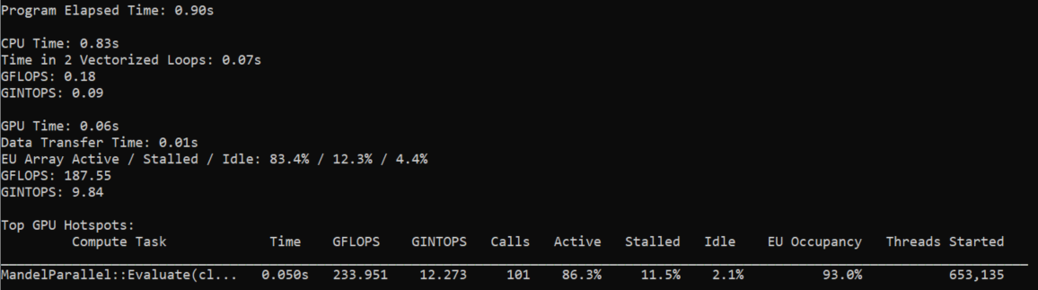 After you run the command, the result summary is printed to the terminal. It contains a summary of metrics for the whole application and for its CPU and GPU parts. The information about top GPU hotspots is displayed as a table with execution time, number of operations per second, number of calls, and execution units-related metrics for each GPU hotspot.