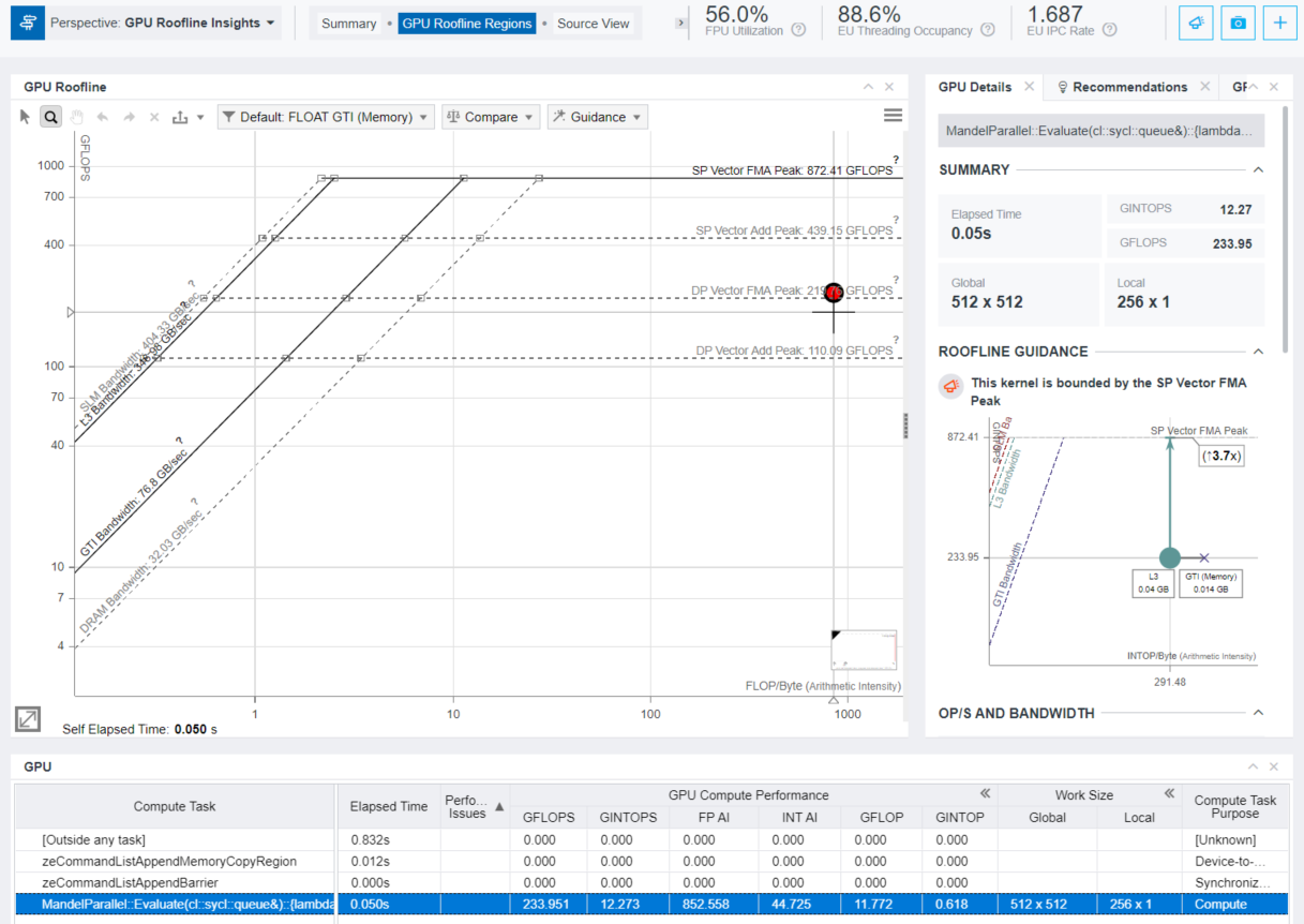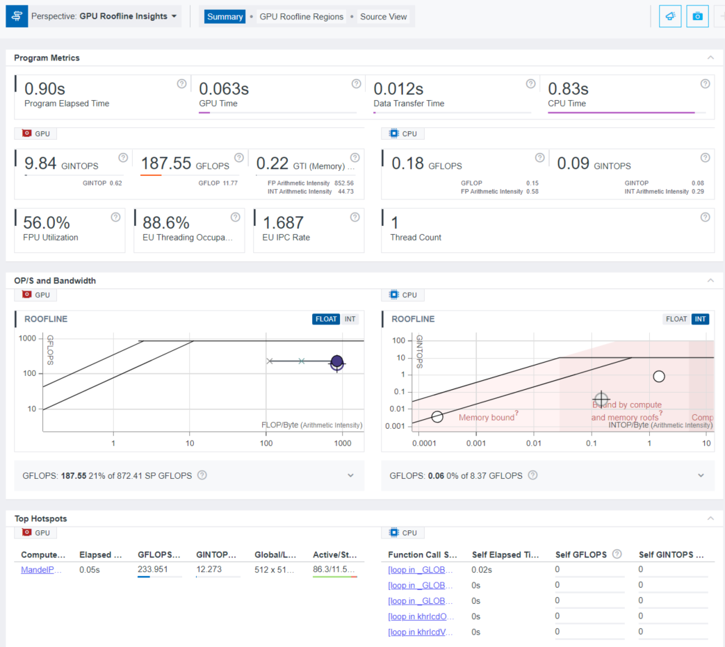 Intel Advisor provides the GPU Roofline Insights perspective to evaluate and improve performance of GPU kernels in SYCL, C++/Fortran with OpenMP* target, Intel® oneAPI Level Zero API (Level Zero), and OpenCL™ applications. Use GPU Roofline Insights perspective to do the following: