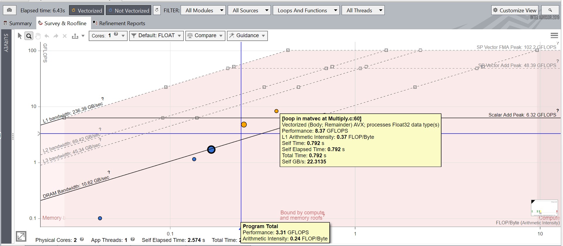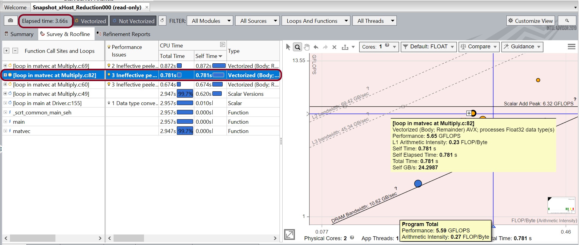 Observe that the loop in matvec at Multiply.c:82 is now vectorized. The Elapsed time is also improved.