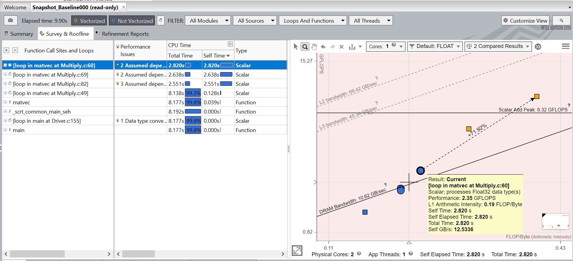 Notice the loop in matvec at Multiply.c:60 in the Roofline plot has changed its color, as it was scalar in Snapshot_Baseline and vectorized in Snapshot_NoAlias.