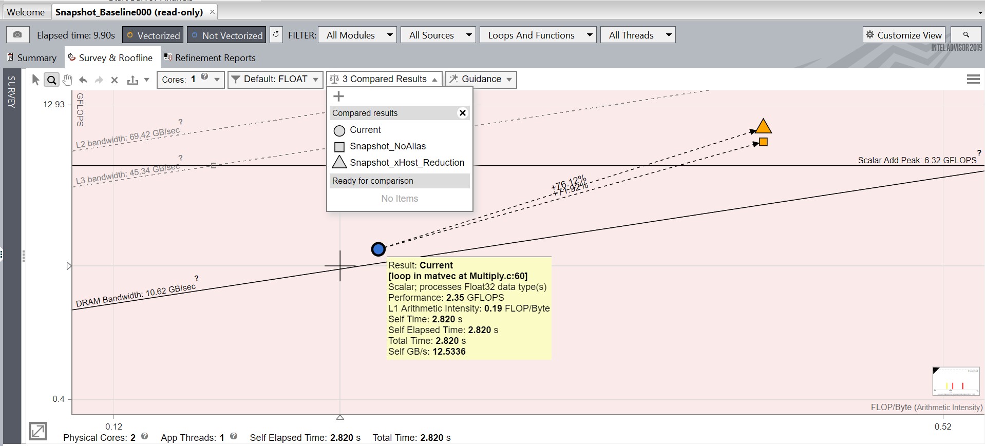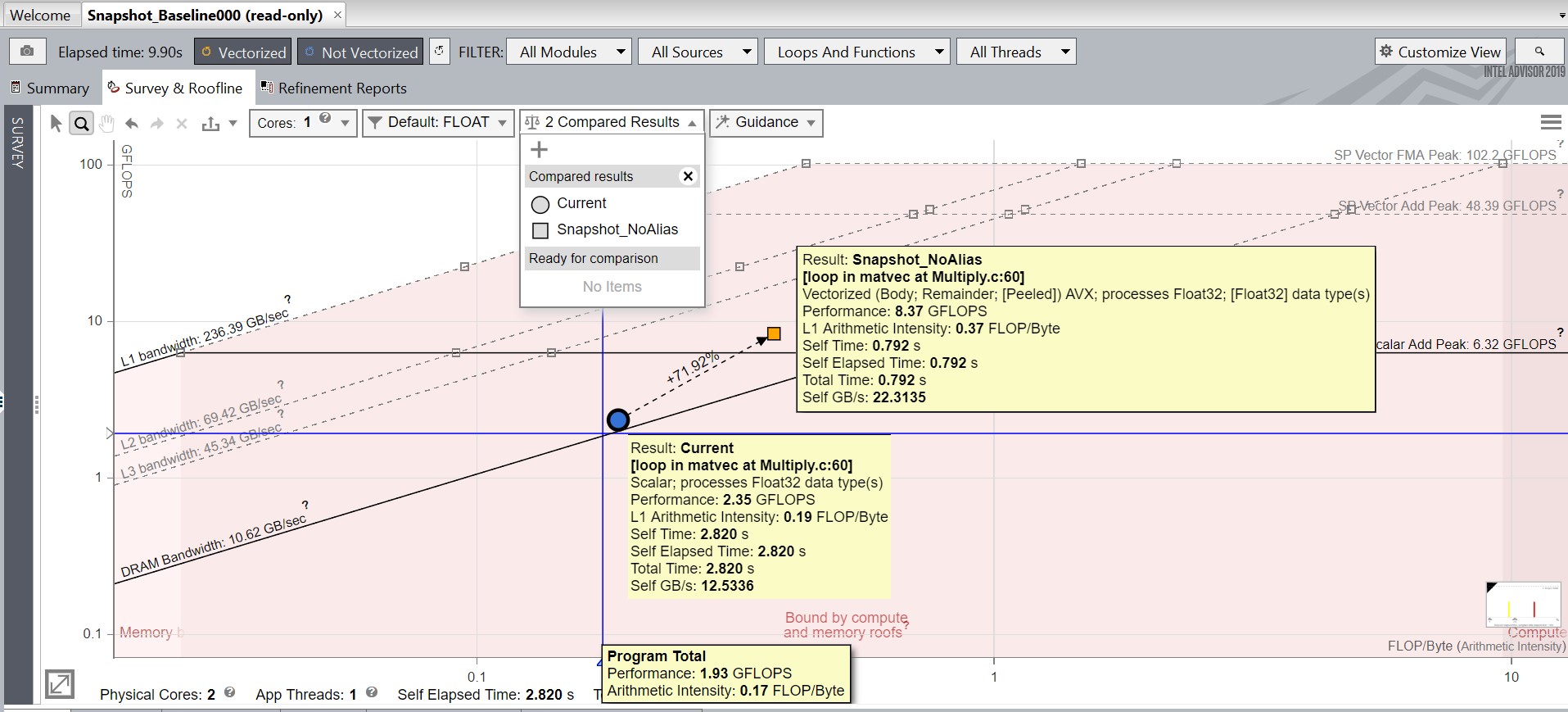 Notice the loop in matvec at Multiply.c:60 in the Roofline plot has changed its color, as it was scalar in Snapshot_Baseline and vectorized in Snapshot_NoAlias.