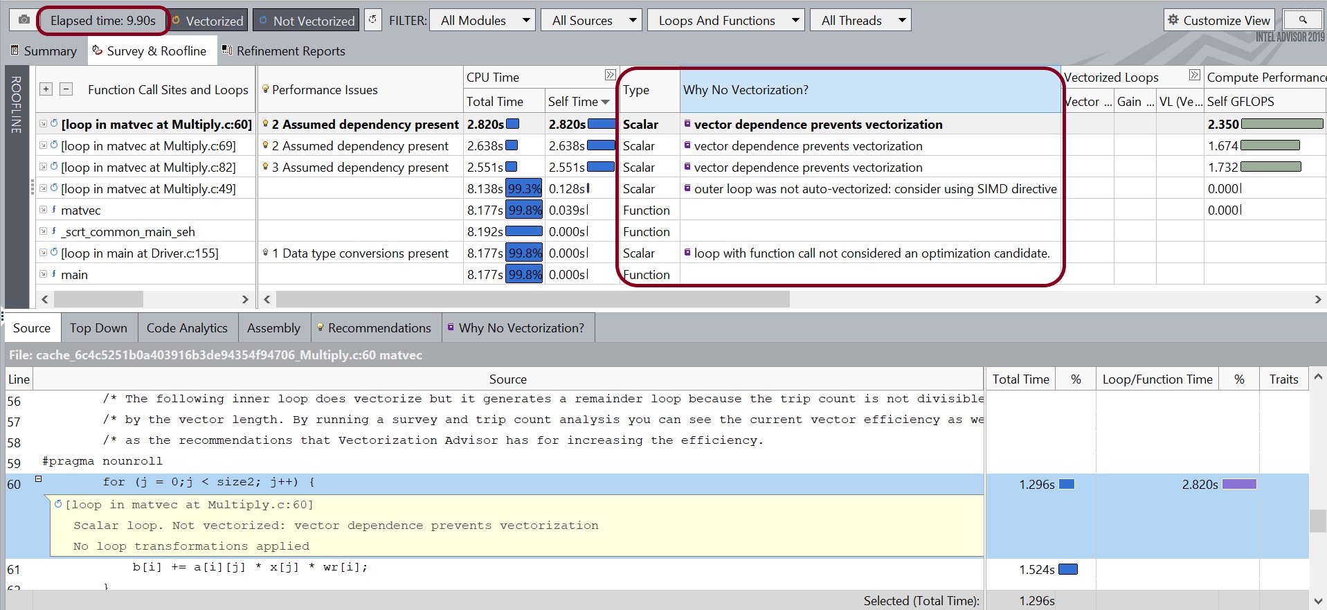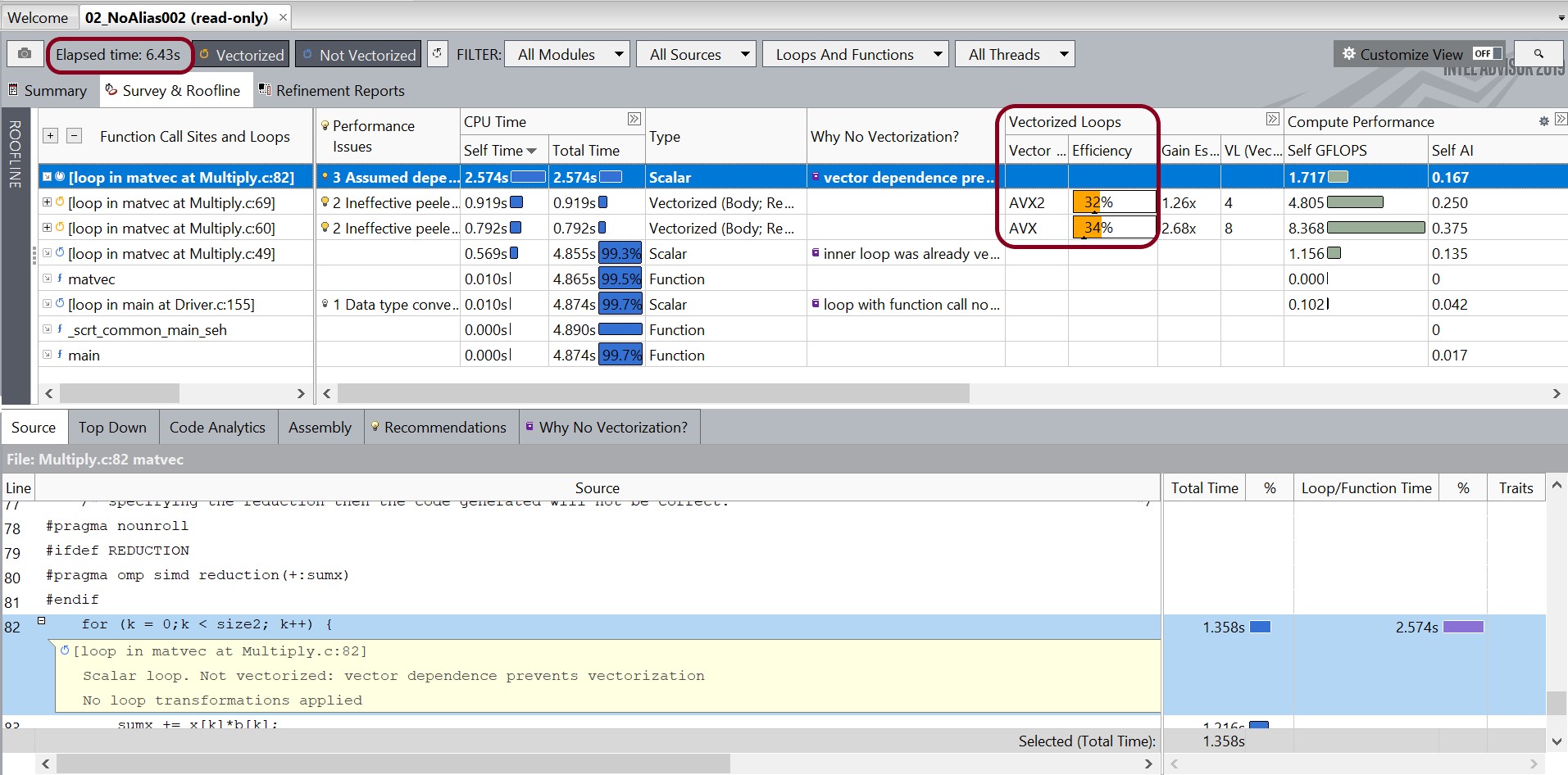 Observe that the loop in matvec at Multiply.c:82 is now vectorized. The Elapsed time is also improved.