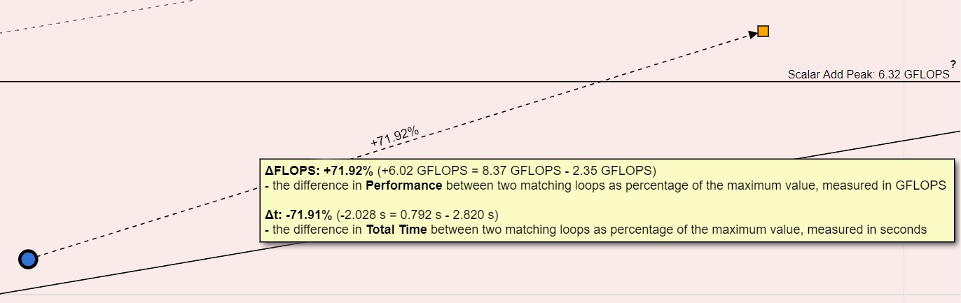 ΔFLOPS (can be also INTOPS or OPS, depending on the data type) implies the Performance difference between the compared loop and current loop. The figure shows that the compared loop has an improved computational performance by 6.02 units*, as performance has increased from 2.35 to 8.37 units. In percentage terms: