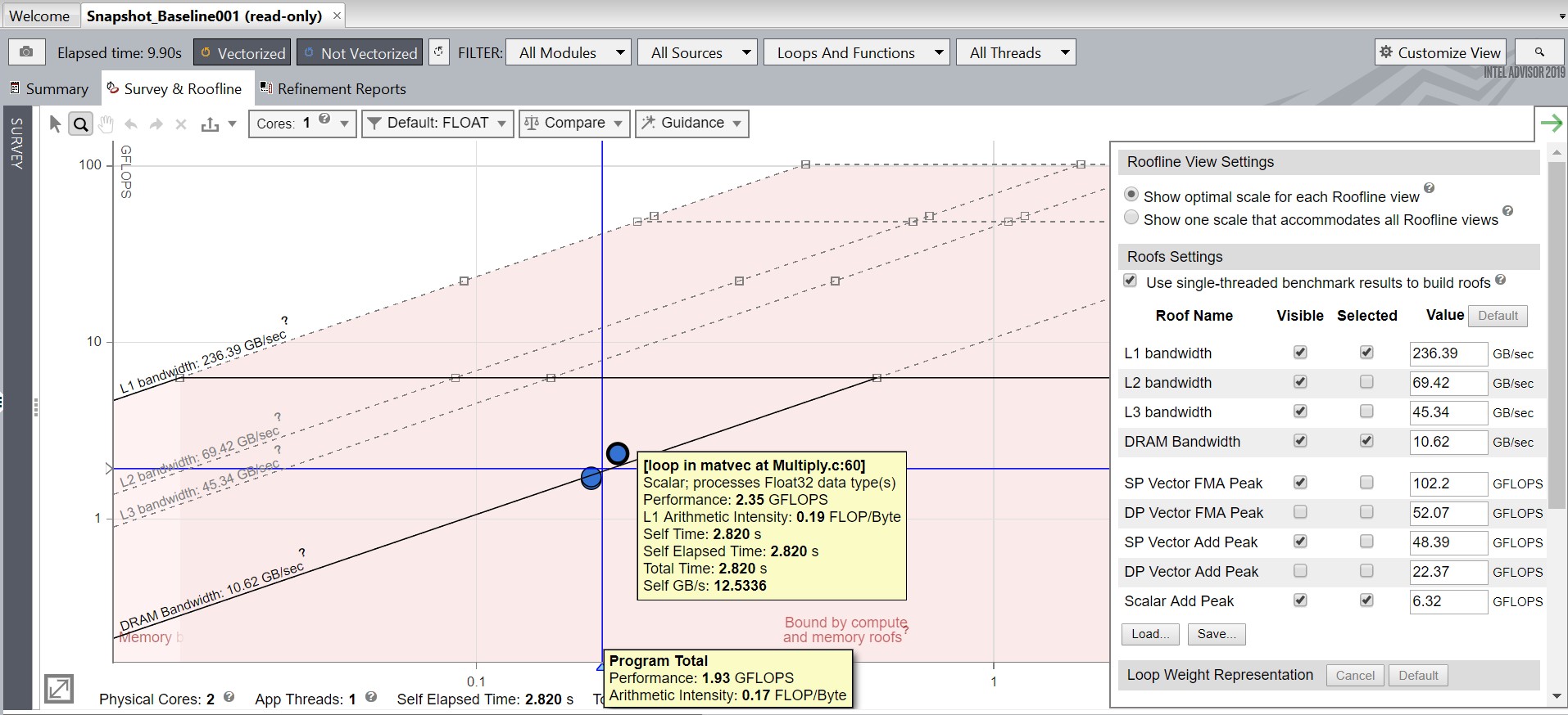 With the default compiler optimization option set to O2, generate a Roofline analysis and save the result using the Snapshot feature . We’ll call this result Snapshot_Baseline. View the Roofline plot, as shown in the image below. As you hover the mouse over the dots, the performance metrics for the loops display. The crosshairs drawn between the loops, which when hovered over with the mouse highlights as blue horizontal and vertical lines, provide performance metrics for the complete program.