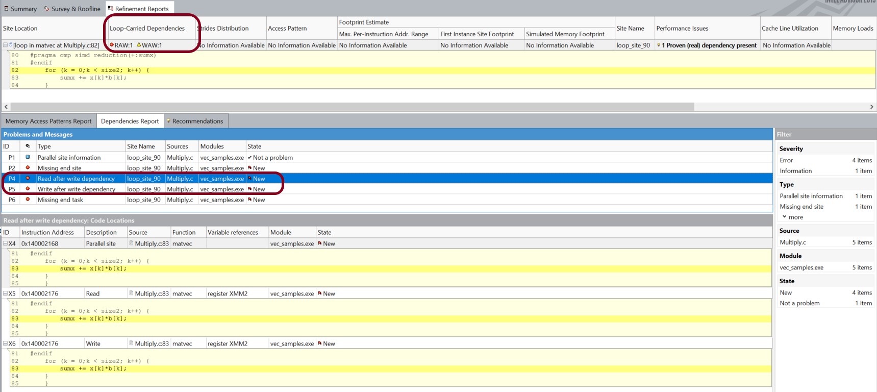 In the top pane of the Refinement Reports window, notice that Intel Advisor reports a RAW and a WAW dependency in the loop in matvec at Multiply.c:82. The Dependencies Report tab in the bottom pane shows the source of the dependency: addition in the sumx variable.