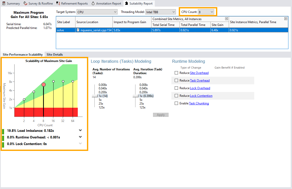 - Go to the Suitability report tab to examine how parallelization can improve the performance: