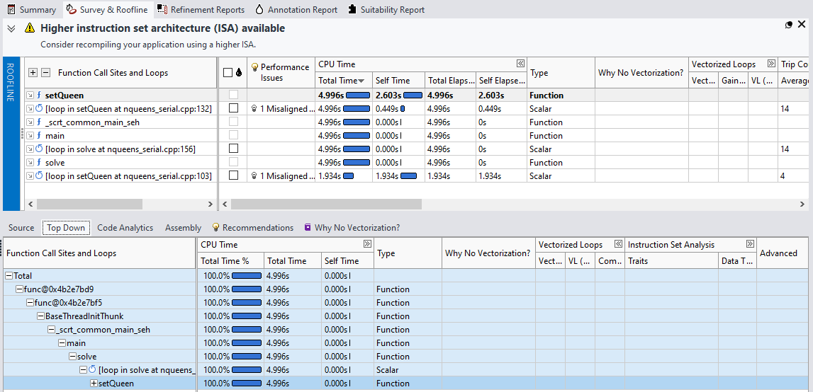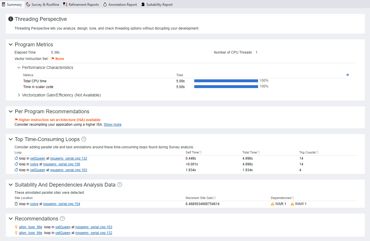 advisor --collect=tripcounts --project-dir=./1_nqueens_serial --search-dir src:r=./1_nqueens_serial -- 1_nqueens_serial.exe - Model threading designs for the annotated functions/loops with the Suitability analysis.