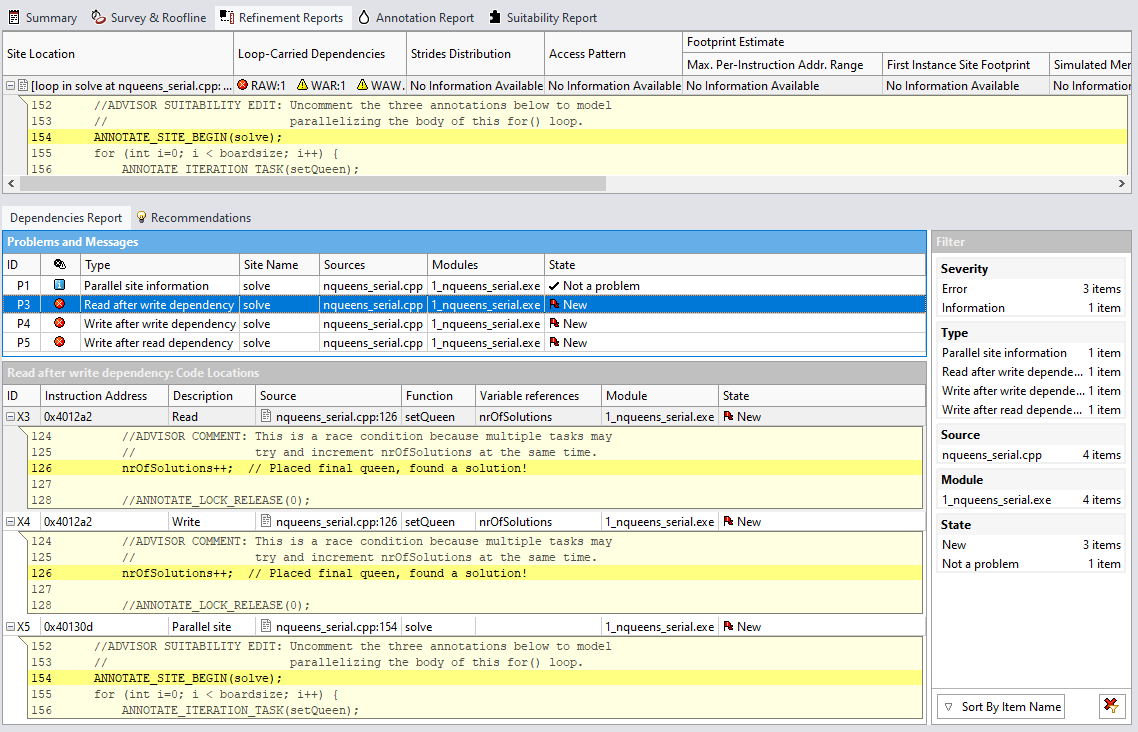 - In the top pane of the Refinement Report, notice RAW (read after write), WAR (write after read), and WAW (write after write) dependencies in the loop in solve at nqueens_serial.cpp:154. T