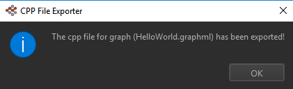 The result of C++ code generation is one file located in the same directory where the GraphML* file is last saved. The file name generated is HelloWorld_stubs.cpp. It should contain the following code: