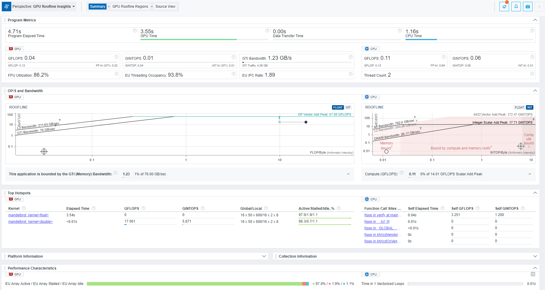 GPU Roofline Insights perspective measures performance of kernels executed on GPU and loops/functions executed on CPU and shows what you should optimize your application for. Examine the following performance data: