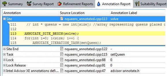 The Annotation Report window displays the annotations for your program. Intel Advisor updates the listed annotations when changes occur to the specified source directories. For example, when you save a source file with a code editor.