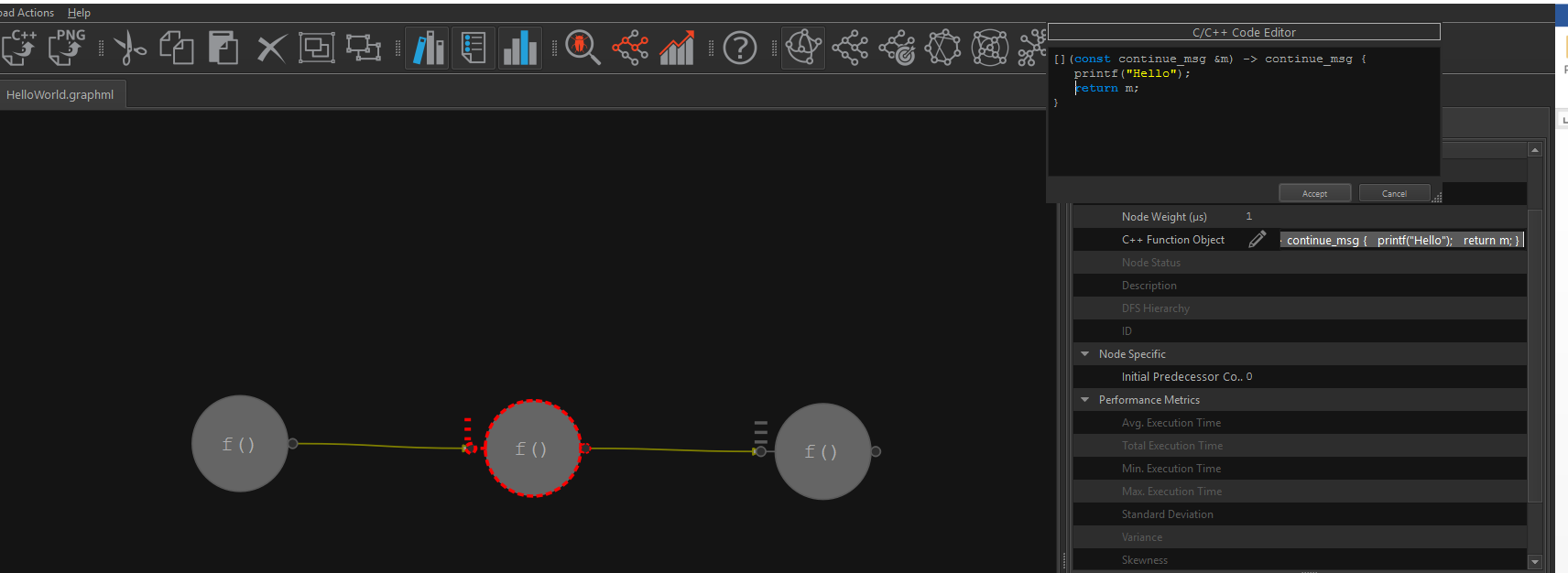 [](const continue_msg &m) -> continue_msg { printf(" World!\n"); return m; }Click the Save icon on the toolbar to save this graph as HelloWorld.graphml.