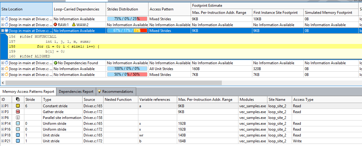 - Click a loop in the top pane to see a detailed report for this loop below in the Memory Access Patterns Report tab.
