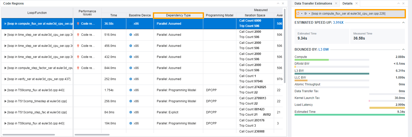 Without the Dependencies analysis, if a loop is not explicitly marked as parallel with pragmas or if a compiler assumes dependencies present, Intel® Advisor assumes the loop is not recommended for offloading because they have high compute time. In this case, you can see high percentage of dependency-bound code regions. To get accurate information about dependencies, run the Dependencies analysis.