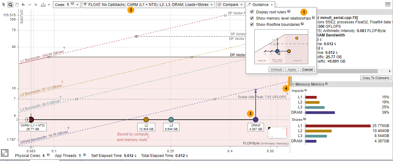 Add visual indicators to the Roofline chart to make the interpretation of data easier, including performance limits and whether loops/functions are memory bound, compute bound, or both. Use the drop-down toolbar to: