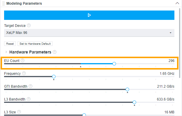 When you open the Summary tab of the Offload Modeling report in the Intel Advisor GUI or the interactive HTML report, you should see the Modeling Parameters pane, which shows the current modeled device and its parameters. Each parameter is a slider you can move to change its value.