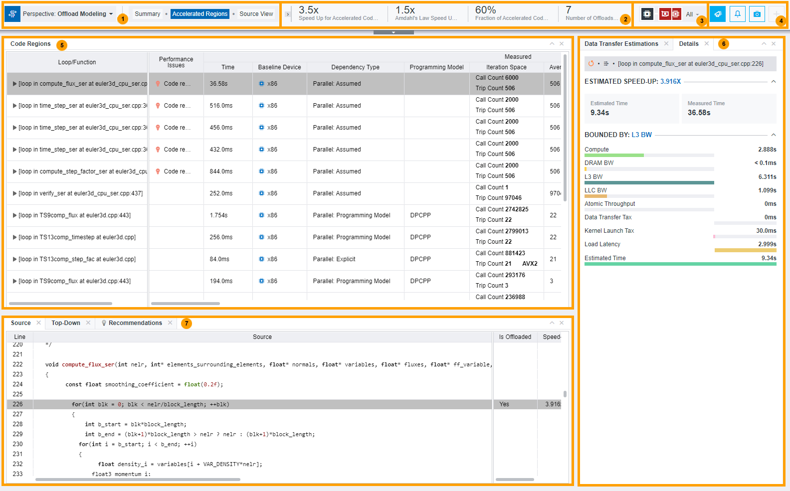 • Examine offload details about the loop, such as loop type, measured and estimated execution time, estimated offload speed-up (for offloaded loops), and reason for not offloading, time for several bounded-by factors. If the loop is not recommended for offloading, this tab also reports the reason for it. For details, see Investigate Non-Offloaded Code Regions.